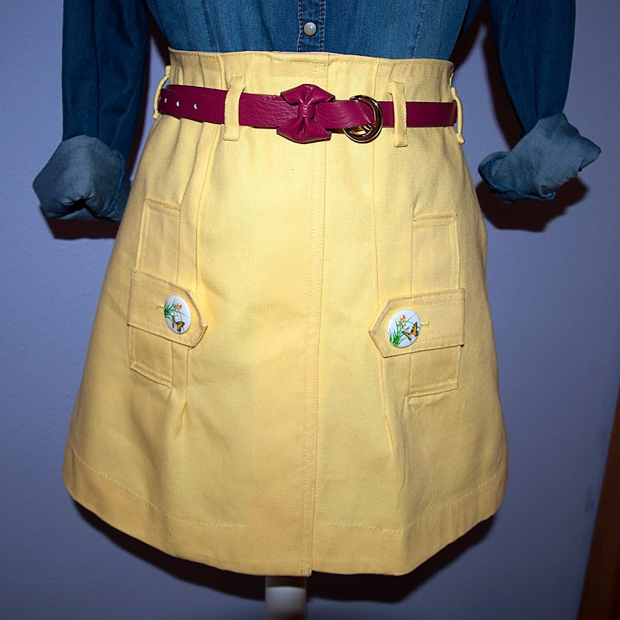 y por ultimo los botones, por unanimidad le he puesto los botones de las mariposas a las trabillas delanteras. y lista mi faldita amarilla, monisima, comoda y favorecedora...aquí os dejo unas fotos, esta vez no tengo fotos con relleno en cuanto tenga alguna prometido que la subo a facebook :)