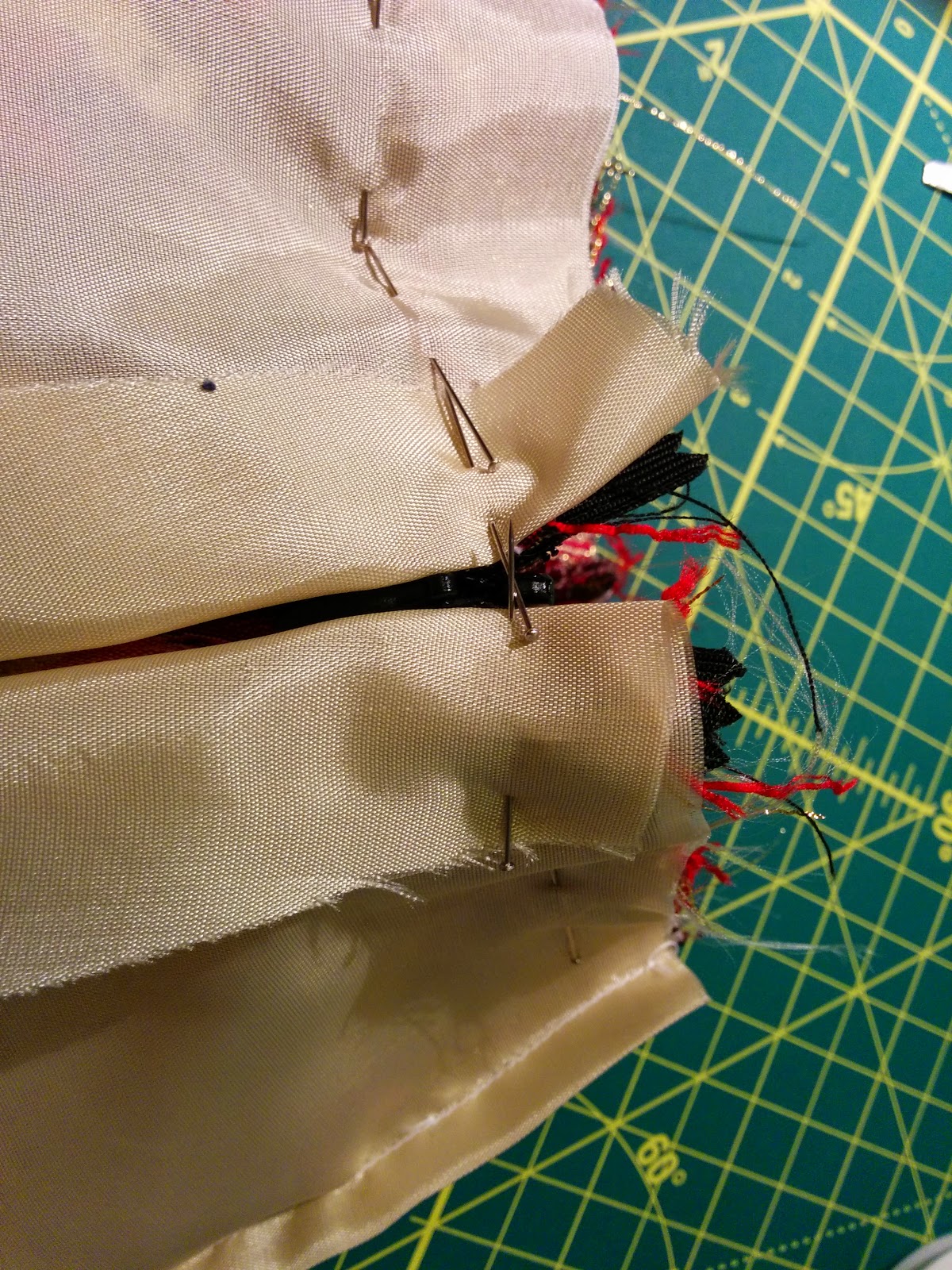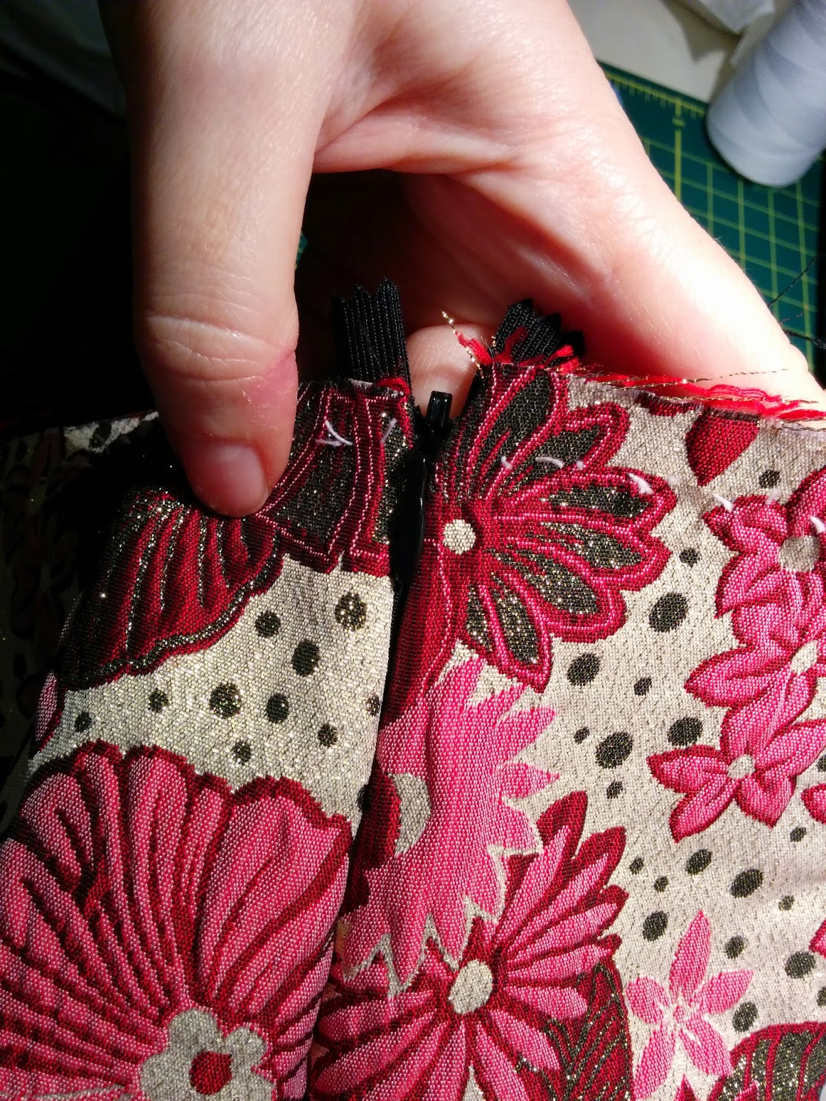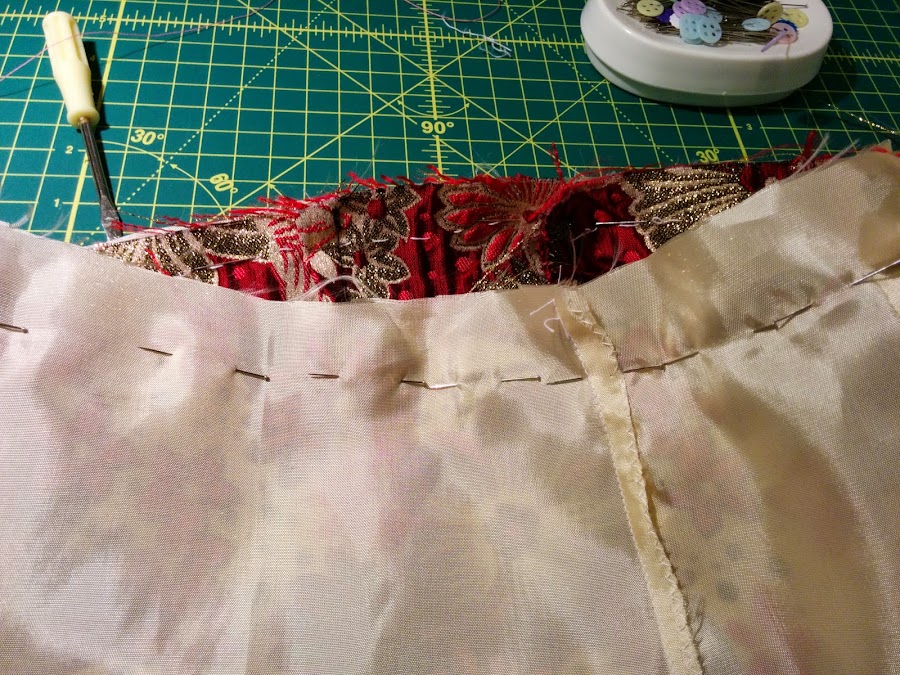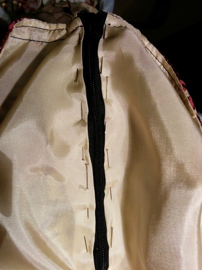 Unimos la cintura uniendo con alfileres por los hilos de la cintura y pasamos un hilvan, CUIDADO!! la cremallera debe cerrar a la misma altura tener en cuenta que al subir la cremallera si no teneis cuidado puede quedar un lado mas largo que otro, marcarlo primero con alfileres e hilvanarlo, comprobar que coincide antes de coser