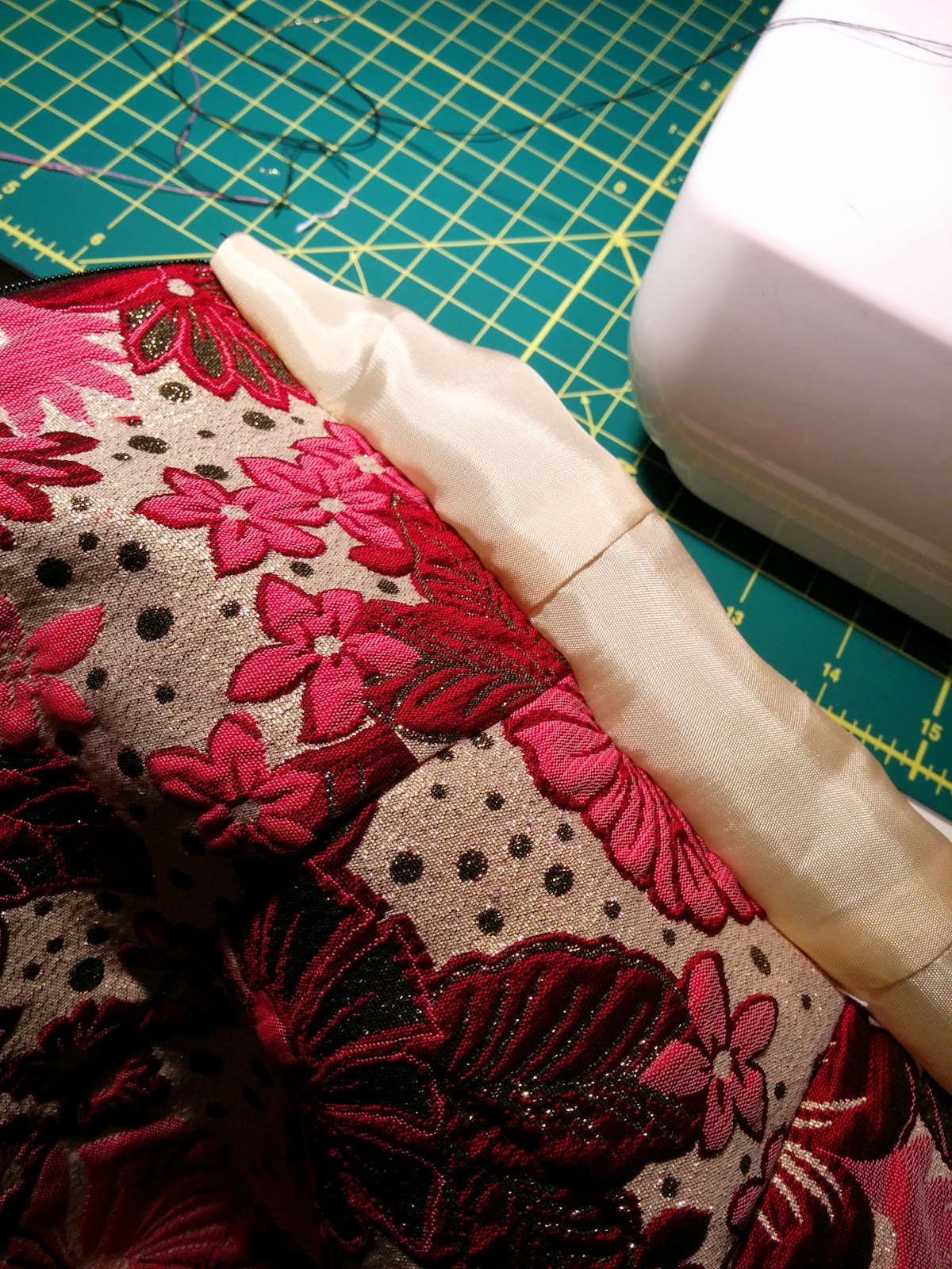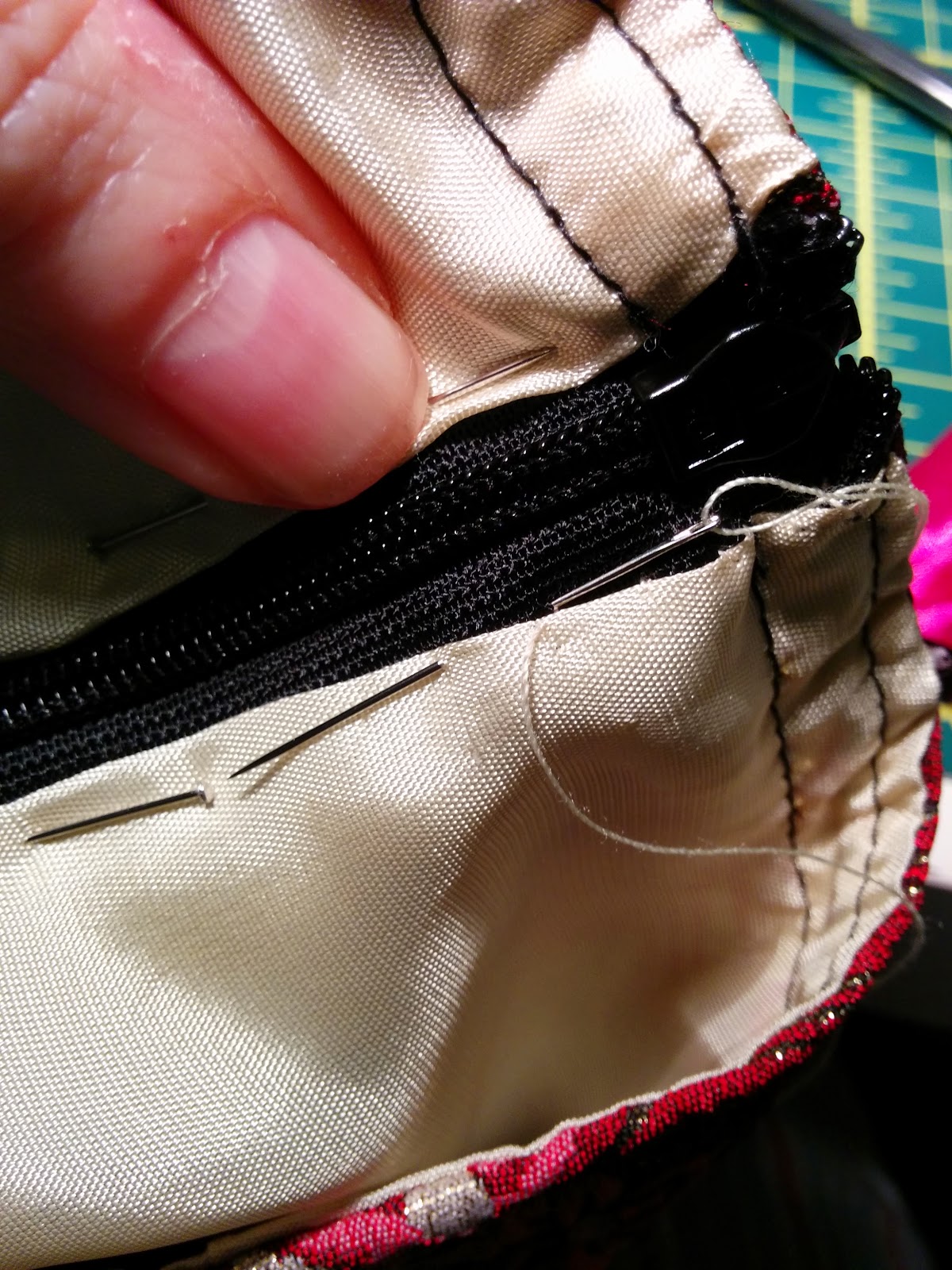 La abertura de la cremallera la cosemos con una puntada escondida de la siguiente forma, el forro lo vamos metiendo hacia adentro para que no se vea.