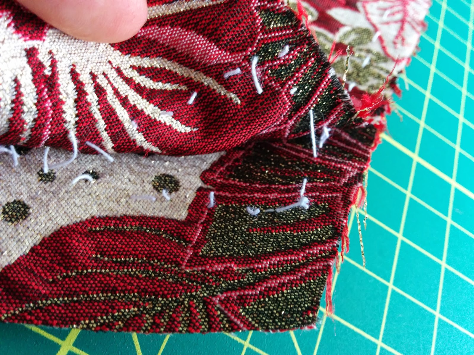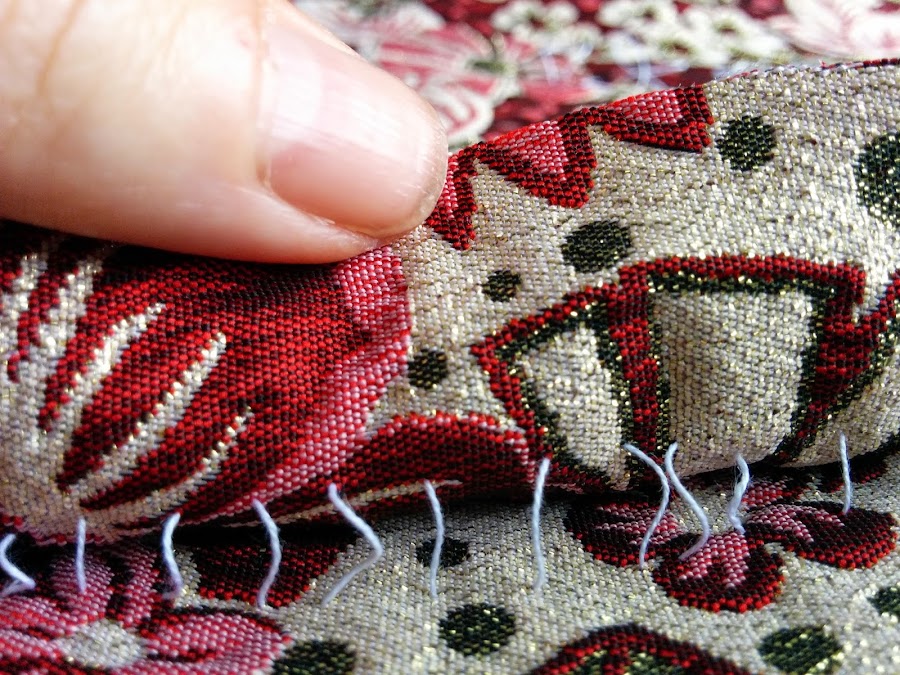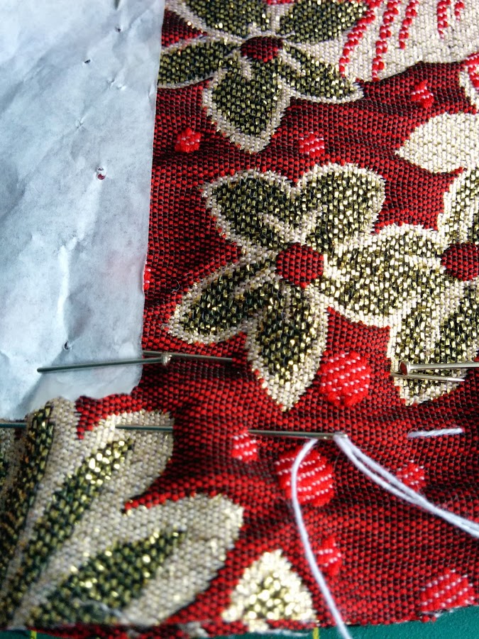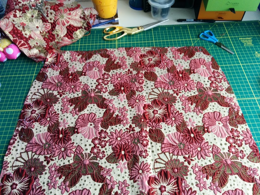 Una vez cortada nos disponemos a pasar hilos, yo lo hago de esta forma, hay muchas formas y yo os propongo esta, a mi no me gusta marcar las telas con tiza en la medida de lo posible (es una manía), prefiero pasar hilos flojos, de esta forma no "manchas" la tela y todo queda marcado a la perfección. Os dejo foto de como paso los hilos.