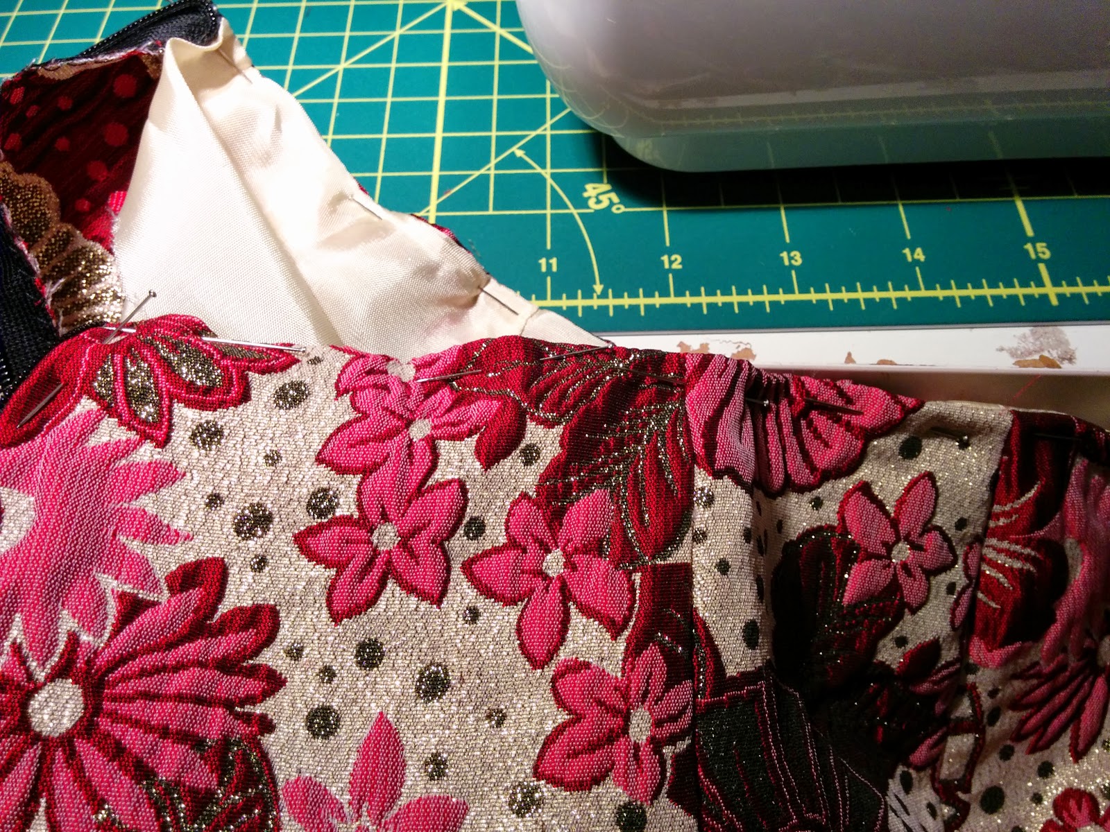 Y por ultimo cosemos el bajo de la falda y el forro, probaros nuevamente la falda y decidir el largo que queréis, en mi caso solo he cogido un par de centímetros, he ido metiendo hacia dentro con alfileres y luego pasado el pespunte, si en vuestro caso es mas, ir midiendo con el metro lo que queréis subir y listo.