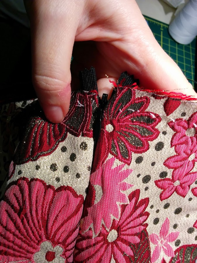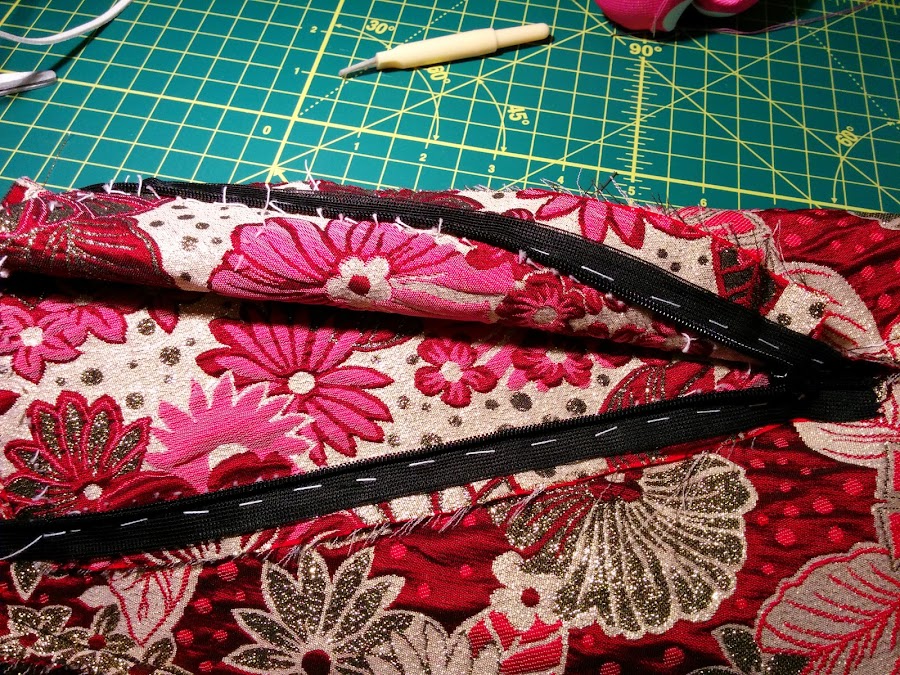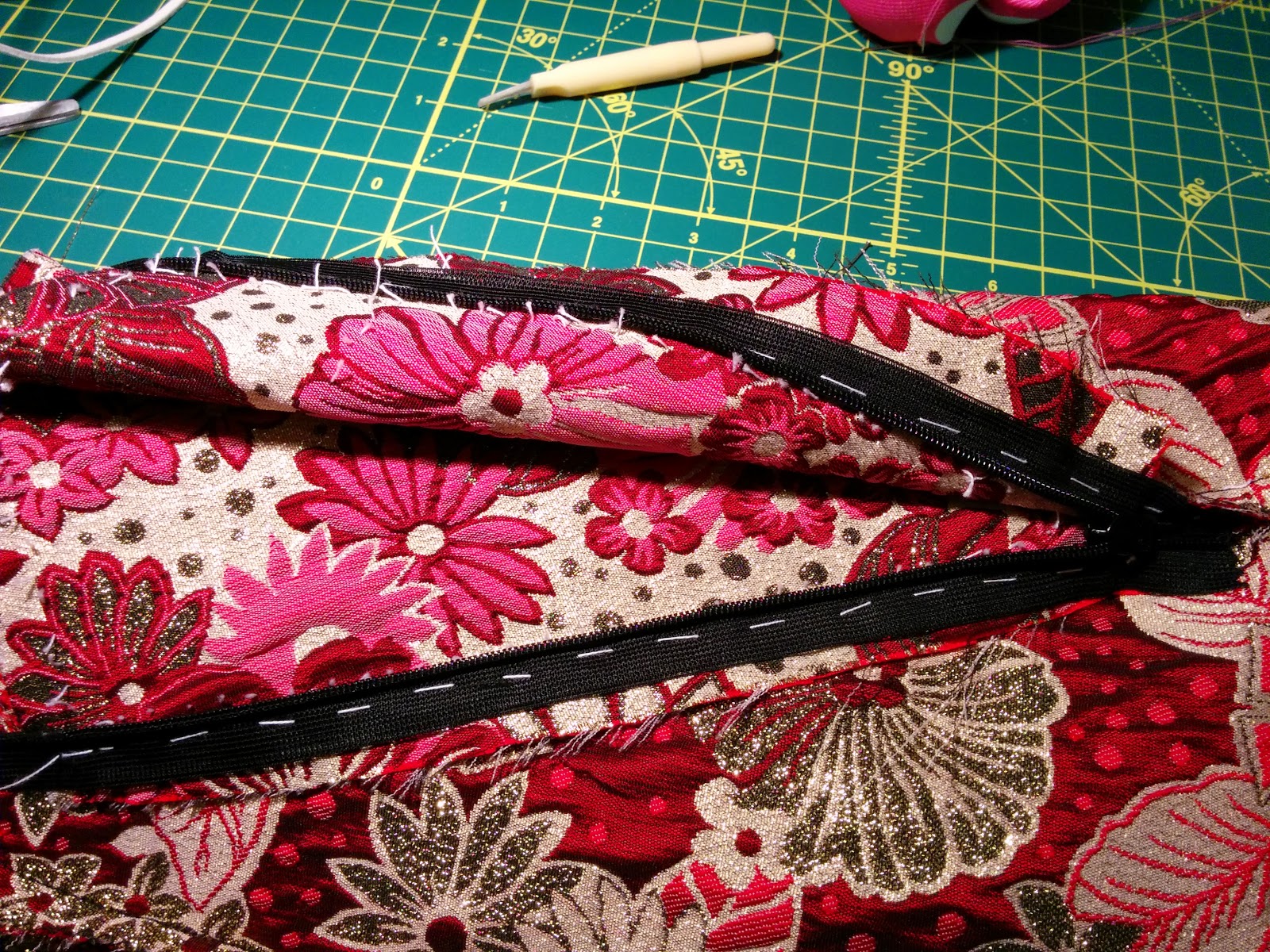 pasamos un hilvan por la parte de la tela de la cremallera no hace falta que este al ras de los dientes de la cremallera, coge solo la parte de la tela interior de la falda, hacemos lo mismo con la otra parte de la cremallera.