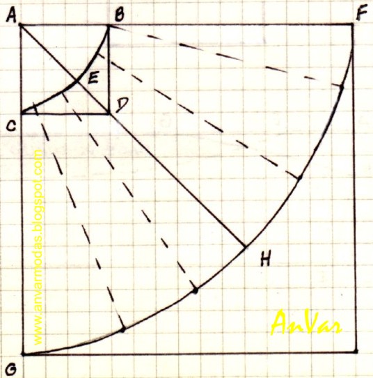 Desde E prolongar la diagonal aplicando nuevamente el largo de falda deseado, pto H.