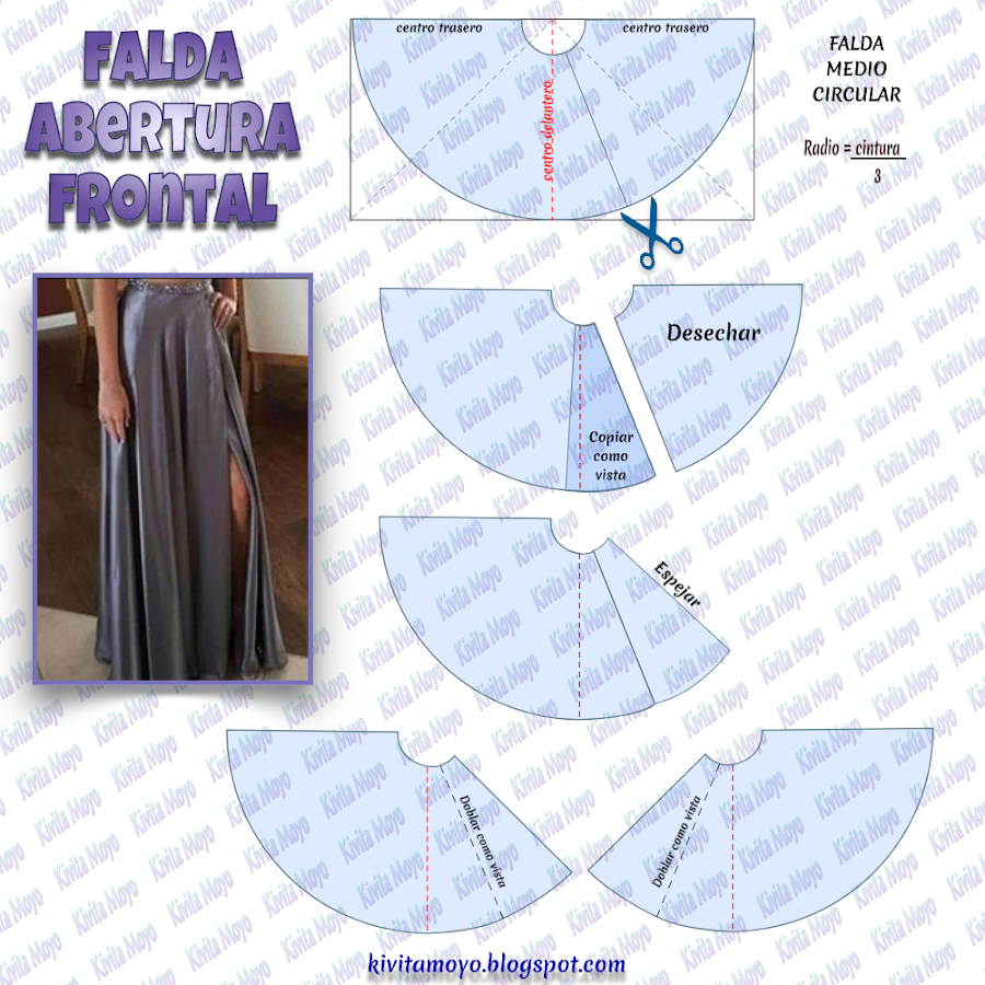 Desplegar el patron y determinar con diagonales desde la mitad del rectangulo hacia sus vertices opuestos, la posicion de los laterales de la falda.