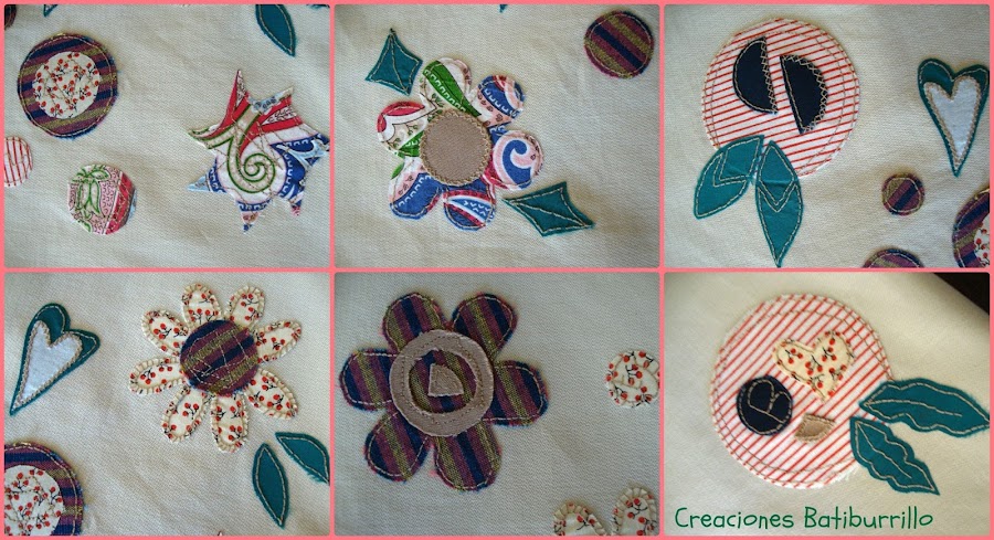 Como veis son formas muy básicas (flores, hojas, círculos y corazones), porque al final lo que va a destacar es el contraste de las telas superpuestas buscar una distribución en la que los elementos encajen.