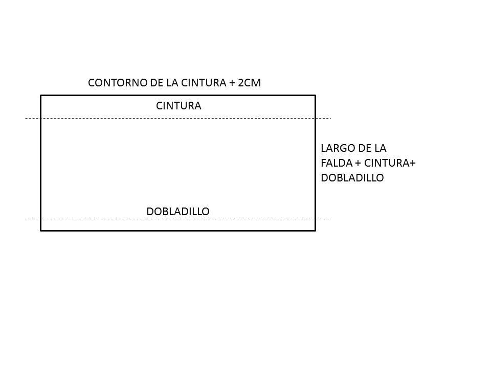 El ancho (que será la cintura) deberá ser del contorno de vuestra cintura más 2 cm de costura y el largo de la tela, será el largo que queráis la falda más el dobladillo de la cintura (que tenéis que tener en cuenta el ancho de vuestra goma) y el dobladillo de abajo que yo lo he hecho de un par de cm.