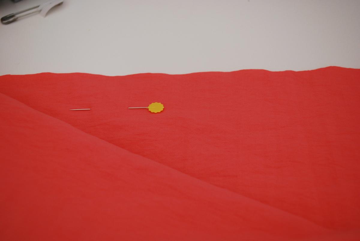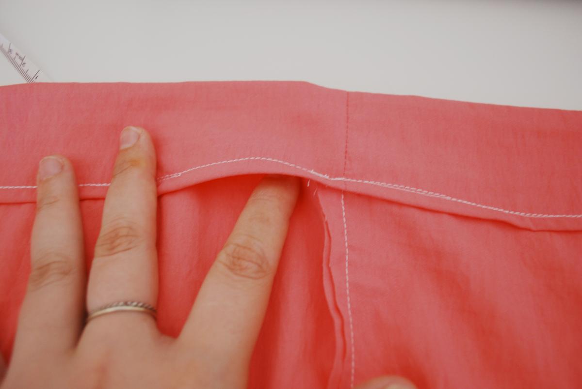 Ahora vamos a hacer el dobladillo de la cintura para poder poner más tarde la goma. Para ellos doblamos una primera vez la tela a 1 cm más o menos y pasamos un pespunte recto.