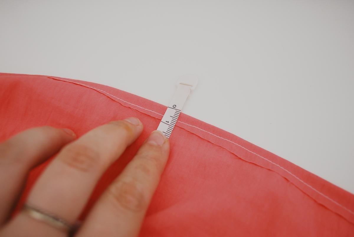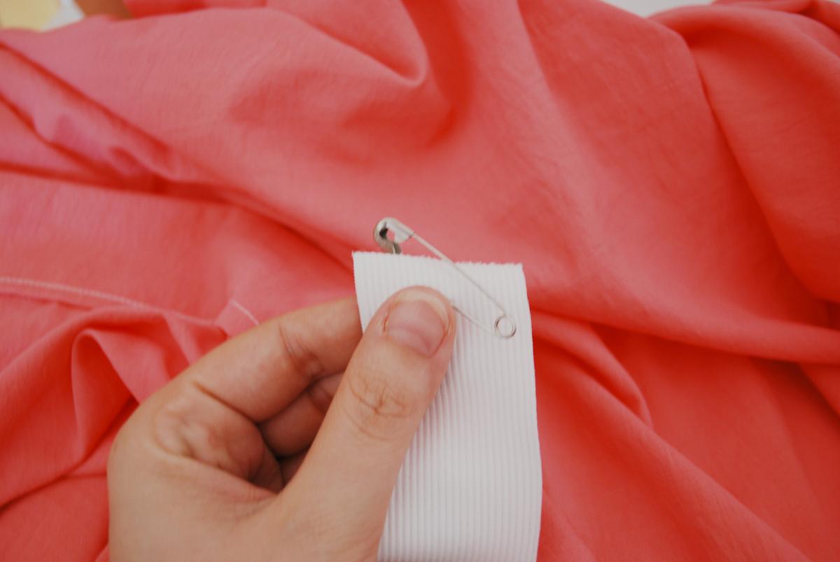 Una vez hecho, volvemos a doblar la tela, pero esta vez, teniendo en cuenta el ancho de nuestra goma, ya que después tendremos que pasarla por dentro. Como mi goma es de 4 cm, he hecho el dobladillo de unos 5,5 cm para no tener luego problemas al pasarla.