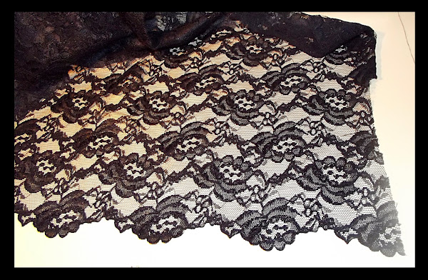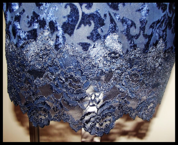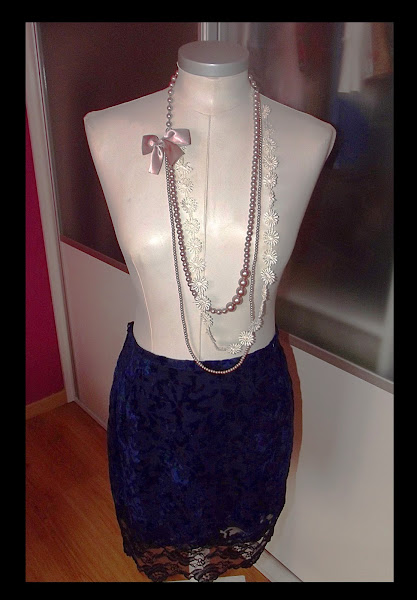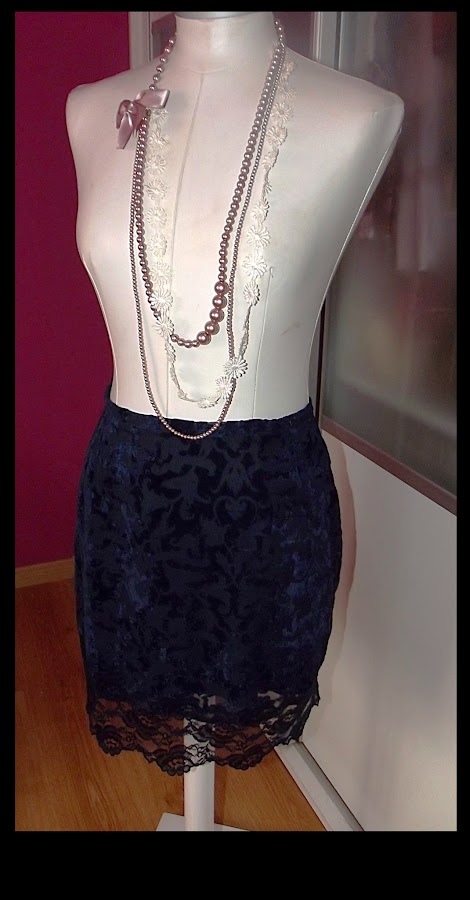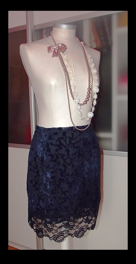 Con el retal del dibujo azul de terciopelo prepare la falda recta un poquito lápiz y luego la puse el forro y la cinturilla, este proceso fue el mas "sencillo", ahora viene la parte especial que hace que la falda se salga un poco de lo común, el trozo de encaje como veis en esta foto tenia una parte con unas ondas muy bonitas, que es la parte que aproveche para poner en el bajo.