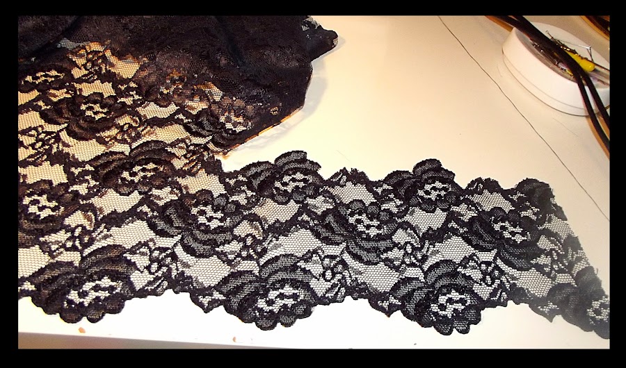Pero no quería cortarlo recto y unirlo sin mas, no me parecía el acabado mas bonito así que con una tijerita y un poco de paciencia recorte el encaje por el borde de las rosas 3 filas mas arriba de la onda por que la iba a poner superpuesta a la tela de terciopelo y no cosida al forro.