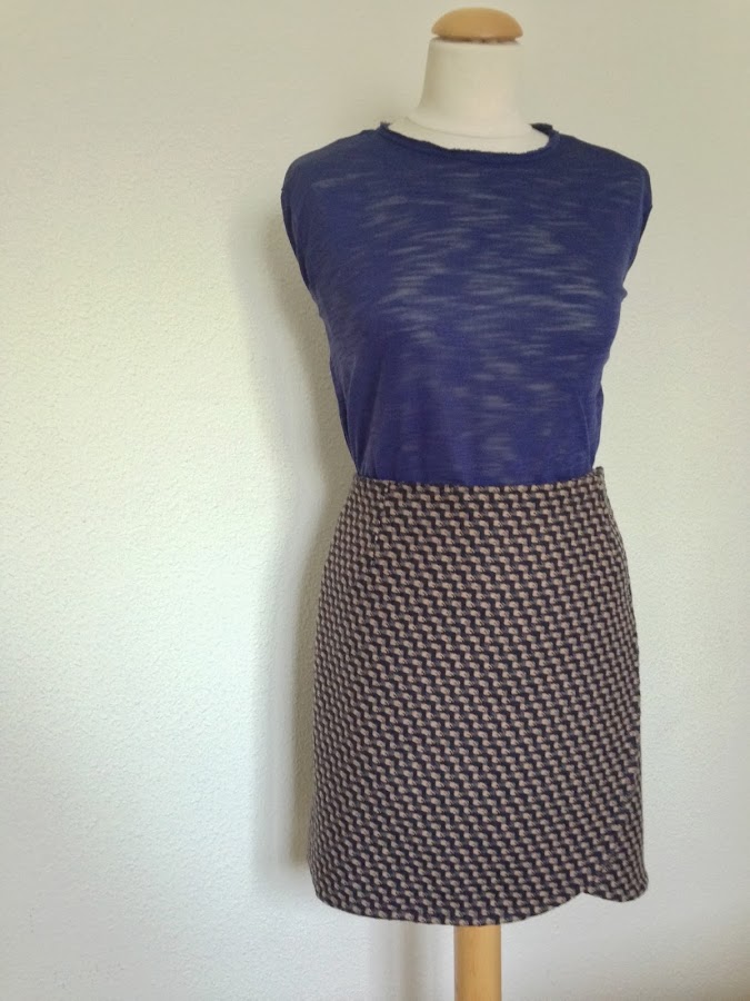 El diseño de la falda está basado en este patrón, una falda recta de talle alto y con abertura delantera que se obtiene al sobreponer los delanteros que se incorporan en las costuras laterales.
