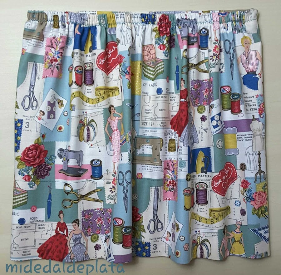 Al ser un corte lineal procura escoger una tela con muchos dibujos o de rayas. Las telas lisas no se aconsejan para este patrón. Yo he utilizado una tela de motivos de costura que mi cuñado me compró por ser mi amigo invisible en Navidad.