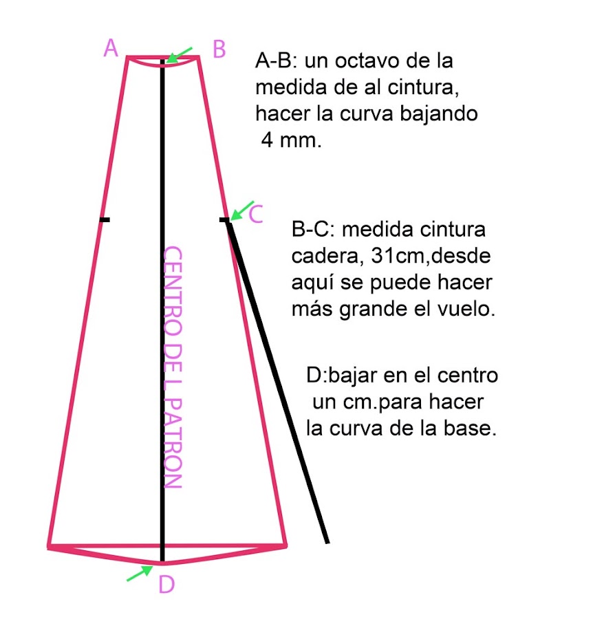 B-C: la distancia desde la cintura a la cadera (31 cm.), desde C tu puedes dar más vuelo al ruedo de la falda, eso a tu gusto.