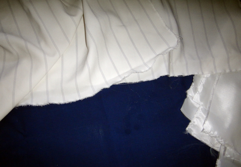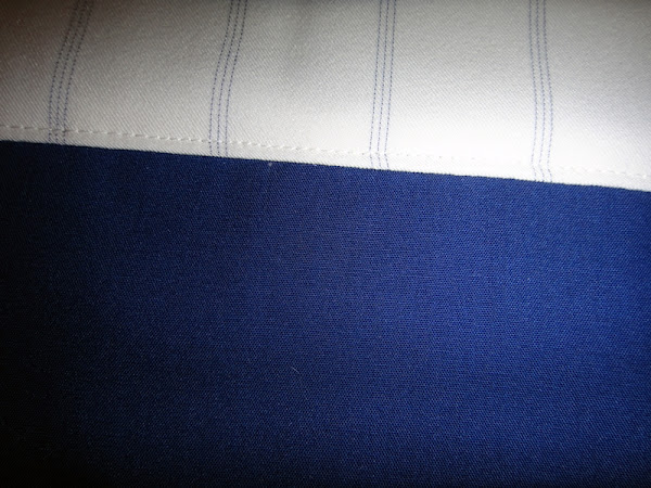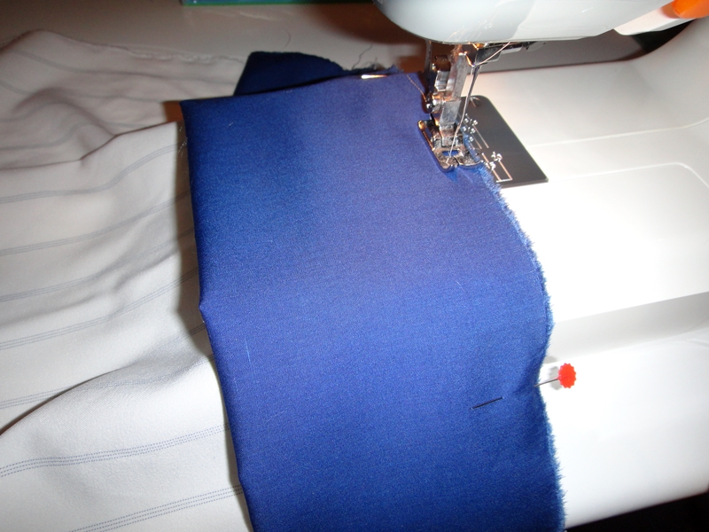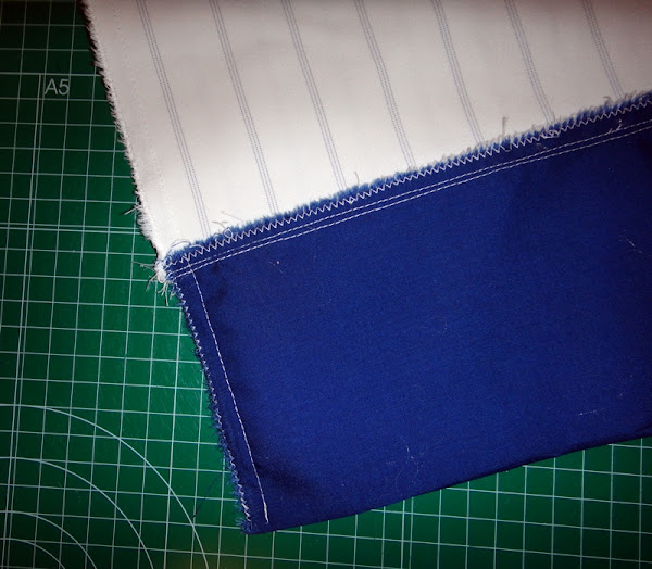 Doblamos los rectángulos azules por la mitad a lo largo, y los cosemos en la parte inferior de la tela de rayas. Nos queda una tira azul de 10 cm en la parte inferior, que además será de doble capa.