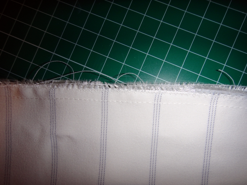 Cosemos la parte superior del forro a la parte superior de la falda, y sobrehilamos si es necesario (yo he sobrehilado todo porque me daba la sensación de que mis telas se deshilachaban bastante, especialmente el forro).
