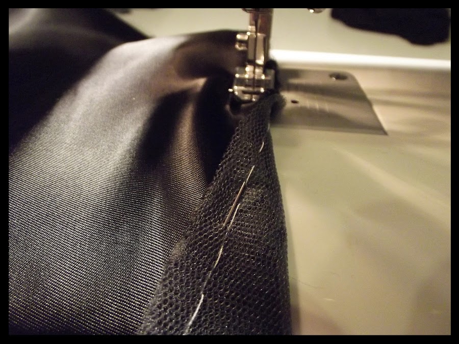 Corte un trozo de forro de la misma medida de contorno y el alto un poco mas largo que la parte de tul mas corta, cosí también el costado a la maquina y lo sobrehilé.