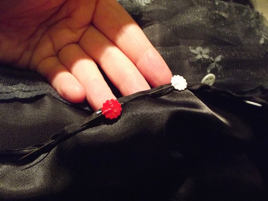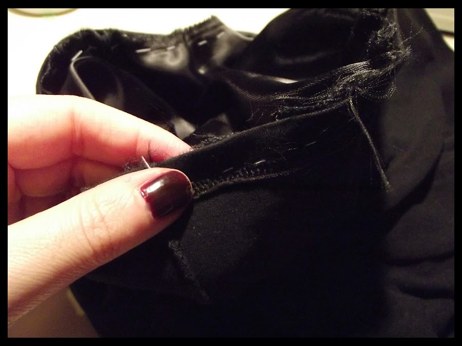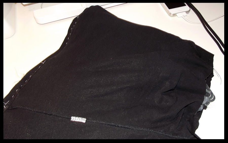 Siguiente paso la cintura, del jersey negro le corte la parte desde la sisas hasta abajo sin descoser el costado, lo puse por el revés y dentro metí la falda por la parte del derecho, no se si lo apreciáis bien en la fotografía