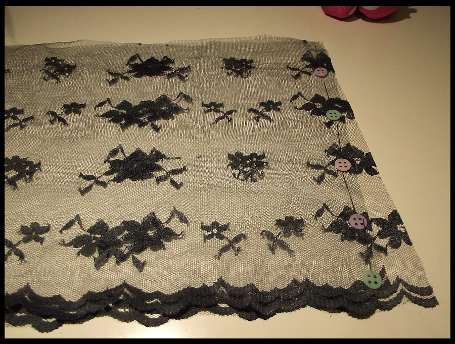 Corte mi tul floreado en 3 partes con la medida de mi cadera mas 15cm, no la queria demasiado fruncida, y a cada parte le di una largura, la parte mas larga con 31 cm, la siguiente con 28 y la mas corta con 25cm, para poner el tul en tres alturas que simulase un volante y aprovechar el ondulado de la tela que a mi gusto era lo mas mono, uní los costados de cada corte y los cosí a la maquina