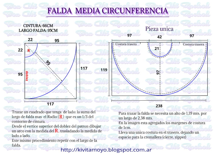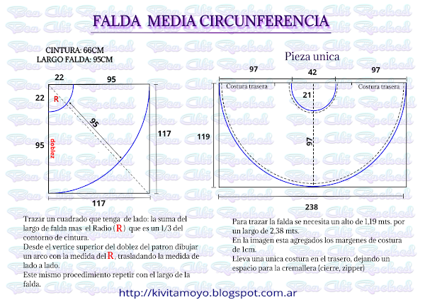 En el siguiente esquema presento el trazado del patron doblado a la mitad. Y luego el patron desplegado sobre la tela. Veran que el segundo dibujo tiene una diferencia en las medidas con respecto del primero. Esto es porque estan agregados los margenes de costura. Observen que el arco interno debe ser mas chico. Si no es asi, la falda tendra 1cm menos de largo.