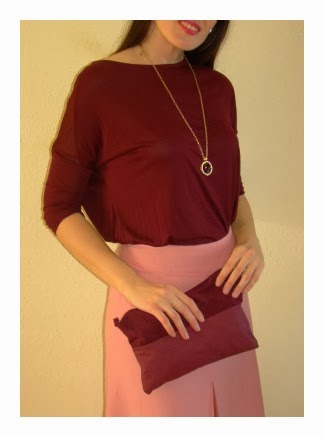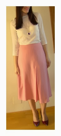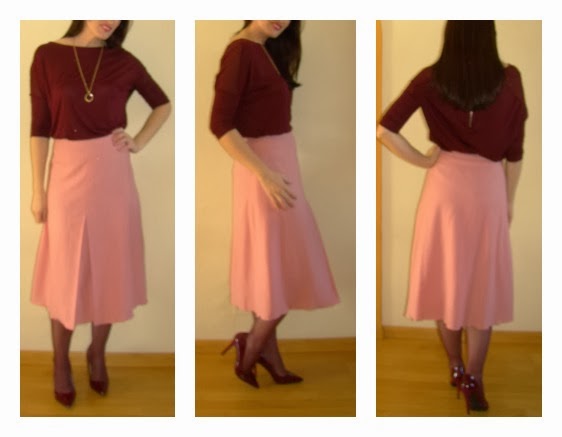 Con este look de falda midi color pastel combinada con granate, participo de nuevo en Rums