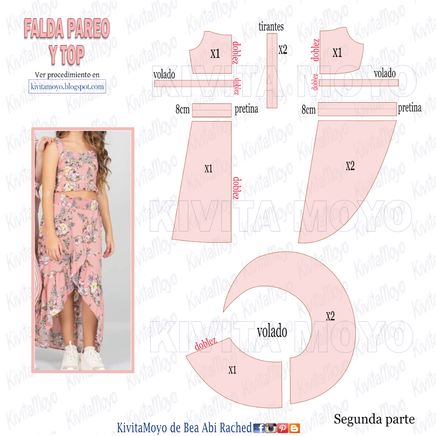 Este modelo se trata de un conjunto comprendido de una falda pareo y un top. Es ideal trabaja el modelo en una tela de punto. Y desde ya el modelo puede variar dependiendo del material que se use, así como el diseño en si. Podríamos modificar el largo de la falda, y tendríamos la opción mini pareo.