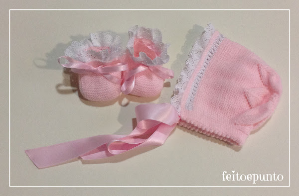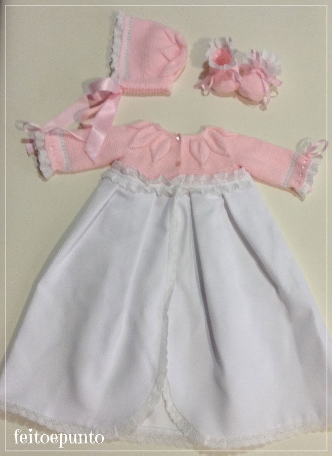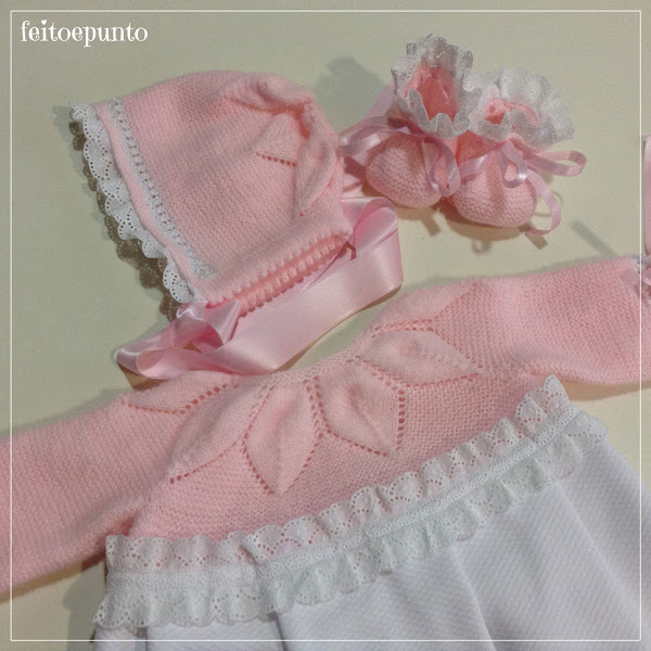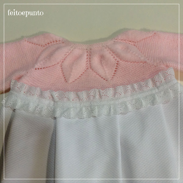 Es un faldón de primera puesta muy sencillo, con mi adoradísimo canesú de hojas, y adornado por un detalle en perlé blanco en puños y contorno de la carita en la capota. Lo más llamativo es el adorno de puntillas a modo de cinturón.