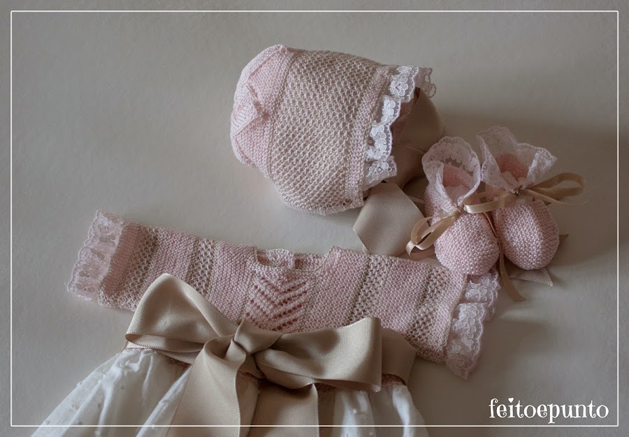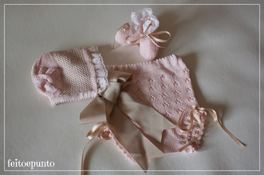 Y fijaos que conjunto tan completito: faldón, capota, patucos,y braguita! Todo para vestir a una preciosa bebé en su primer día en el mundo...