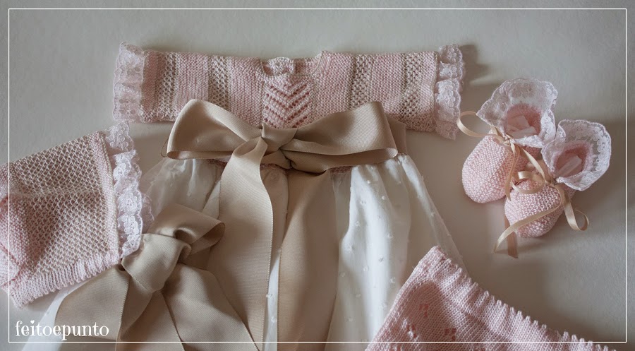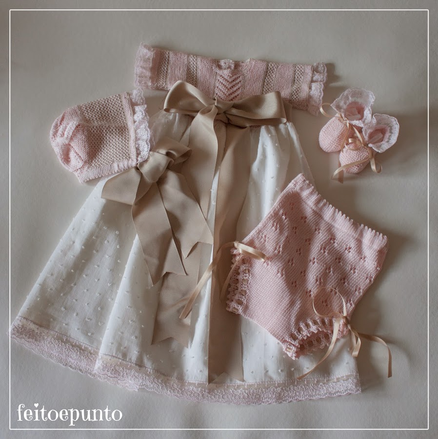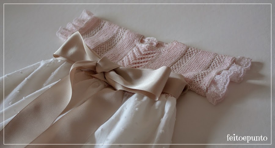 Hoy toca otra versión de este faldón que ya es un clásico para mí. Cuerpo tejido en perlé finito y la falda de plumeti, adornado con unos anchos lazos. Es una combinación a la que no me puedo resistir.