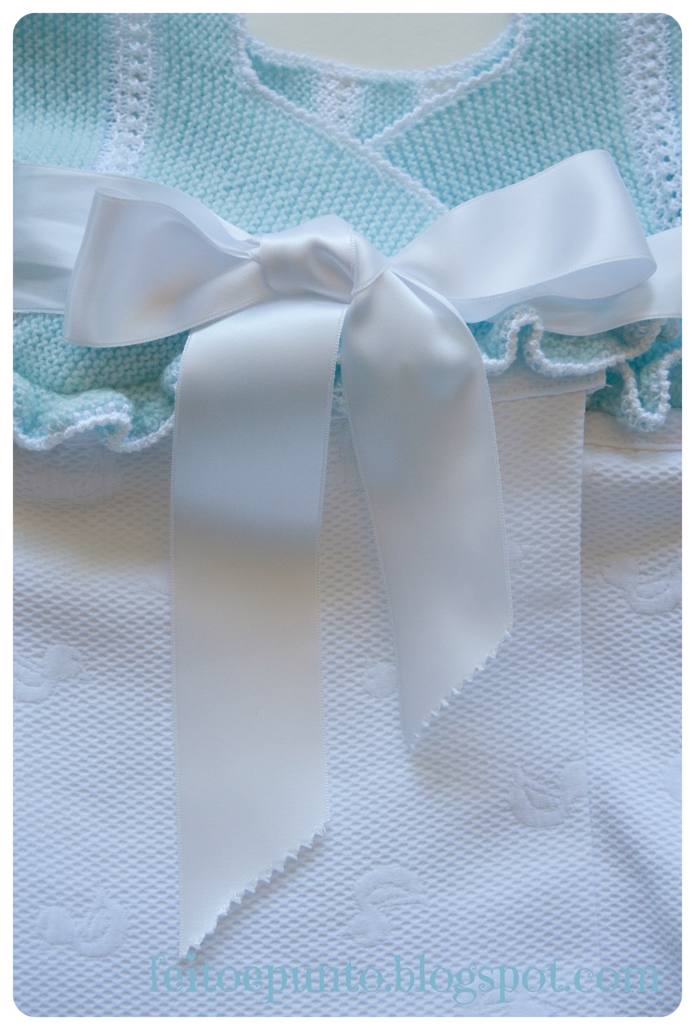 Y a la capota le hice ese "invento" para atarla. Utilicé un bies de raso porque ya no me quedaba tela para hacerlo en piqué, y le metí en medio la puntilla. Quizá (cuando sepa para quien será...) lo corte para hacer que se cierre abotonando a un lado. Pero aún así... ¿qué os parece mi invento?