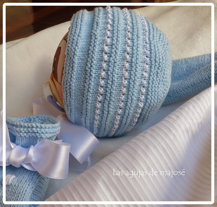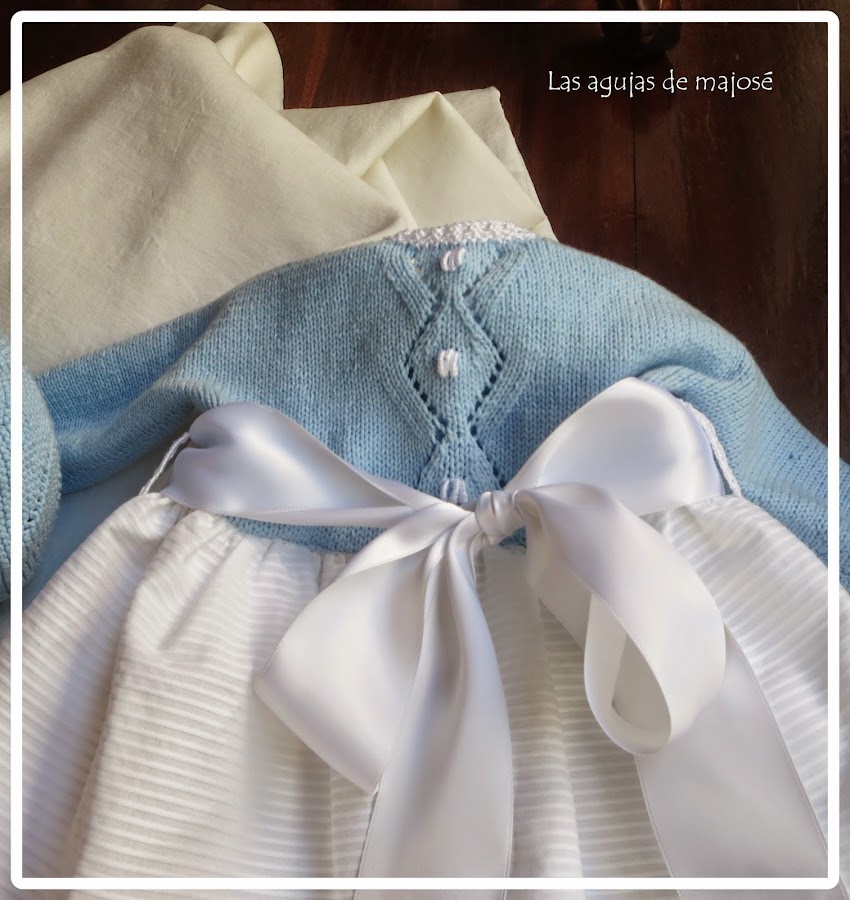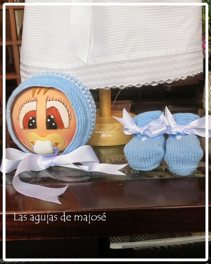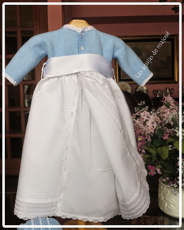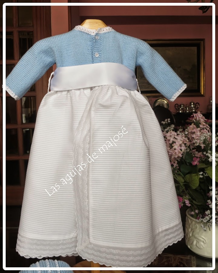 Lleva capota y patucos, es el conjunto completo, y tanto la parte delantera del jubón como los patucos van adornado con unos detalles en punto rococó.