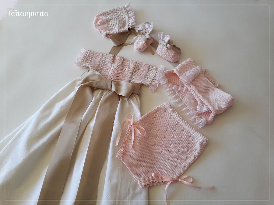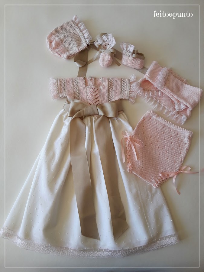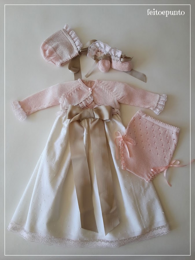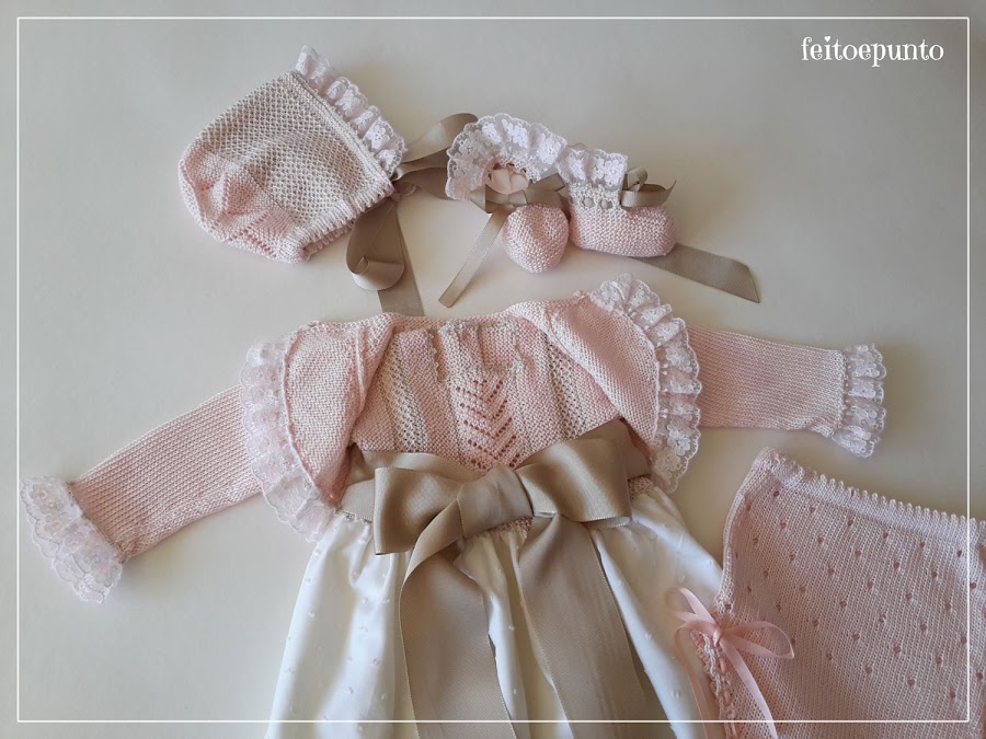 Cuando creía que ya había hecho todas las versiones posibles de este faldón una futura mamá me planteó un nuevo reto, hacer el faldón en manga corta con chaqueta a juego! Y gracias a ella os puedo enseñar este conjunto, el más completo de todos los que hice.