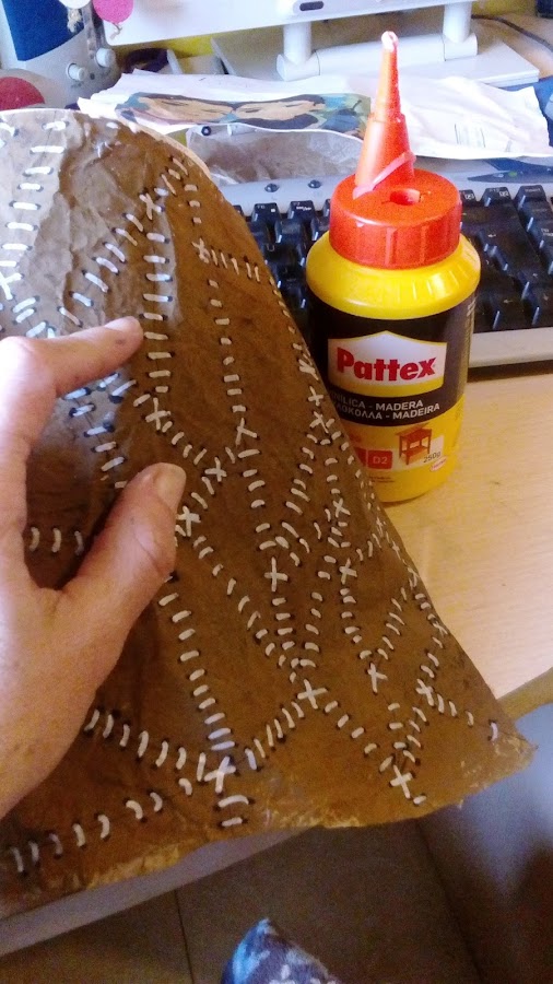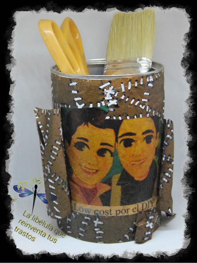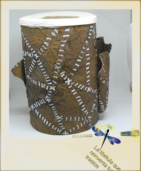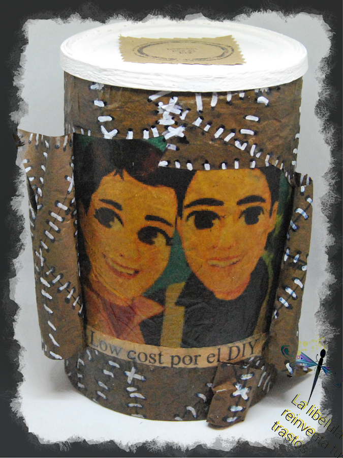 Y Simplemente procedo a colocar el falso cuero alrededor del bote, con cola blanca, y arrugando con los dedos el papel, para que vayan quedando arruguitas (que gustazo por una vez no estar sufriendo por ellas, jeje).