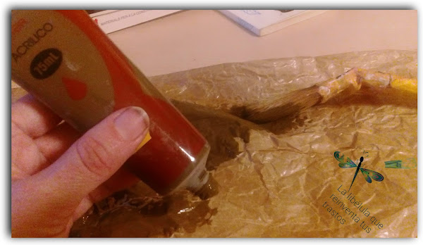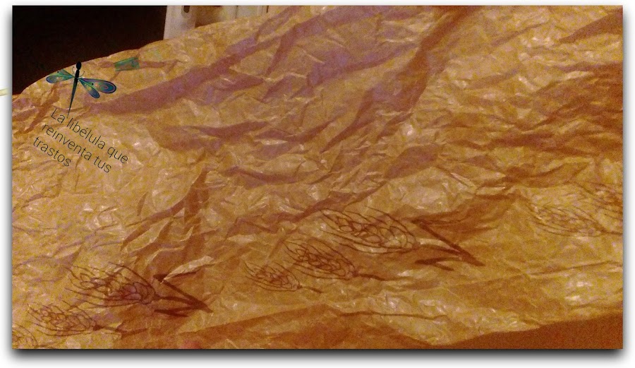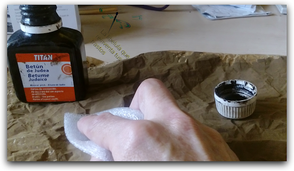 Y con un trapo y un poco de betún de judea ensucio el papel un poco, después de secarse la pintura, para dar un aspecto mas envejecido. Despues de que haya secado todo, arrugo, estrujo y hago una bola con el papel, para que quede arrugado.