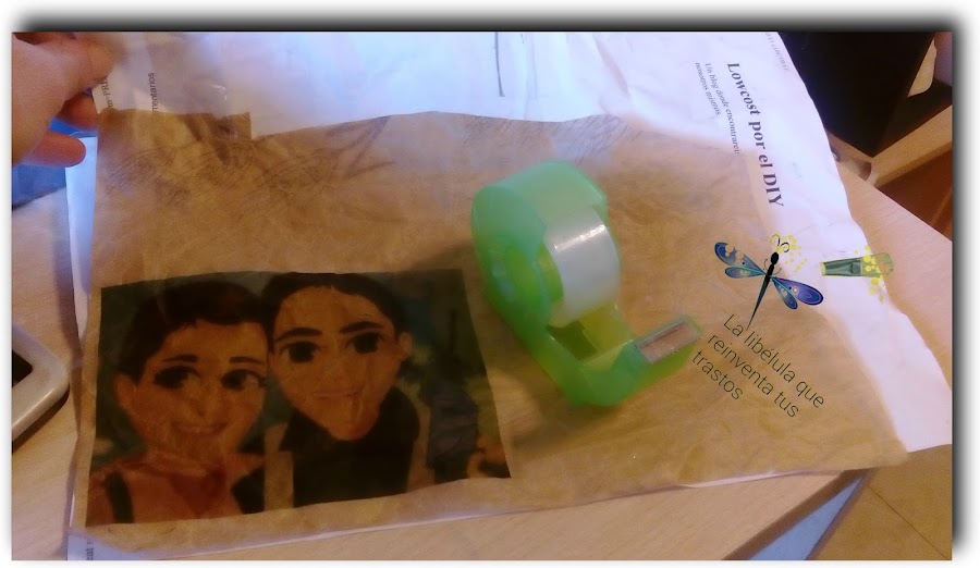 La imagen la coloco con la técnica del decoupage, la encolo toda, y luego por encima, una capa de cola blanca diluida en un poco de agua, a modo de protección.