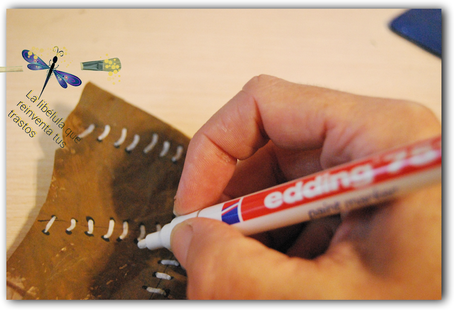 Pero no me acaba de convencer el resultado, no lo veo ni muy real ni vistoso, y pruebo con otro rotulador permanente, pero de color blanco, y este si, eureka!! Simulo la puntada blanca,y remato con los agujeros de la puntada en negro, ahora si me gusta más, pero mucho mas!!