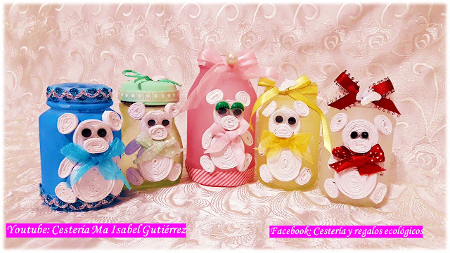 Con los tubitos o varillas de papel hacemos enrollados de diferentes tamaños para formar el osito, dependiendo del tamaño del frasco es el tamaño de las piezas o enrollados...