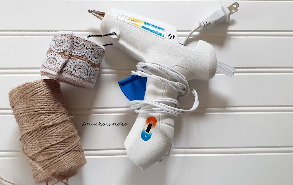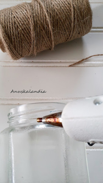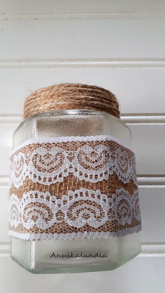4.- Decoramos el centro del frasco con la tela de arpillera, en mi caso elegí una con puntilla blanca. Sólo tenemos que pegarla con silicona al frasco.