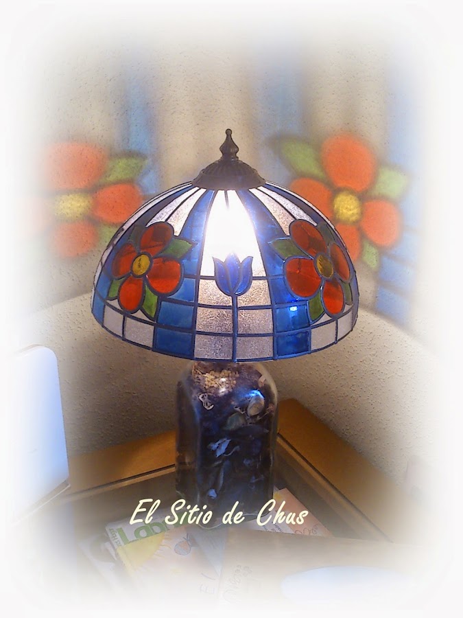 El pie no es obra mía, es de mi amigo Jesús. Me regaló la lámpara completa hace muchos años, me encantaba y no la hubiera cambiado si no hubiera sido porque a la pantalla anterior le cayó agua del aire acondicionado. Pero ahora me alegro, porque el cambio me ha gustado mucho, y a los niños, no os quiero ni contar, eso que se reflejen las flores en la pared, les vuelve locos!!!