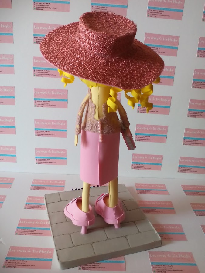 Vestido entallado de encaje con Pamela a juego, zapatos de tacón, bolso de mano y pelo recogido a un lado.