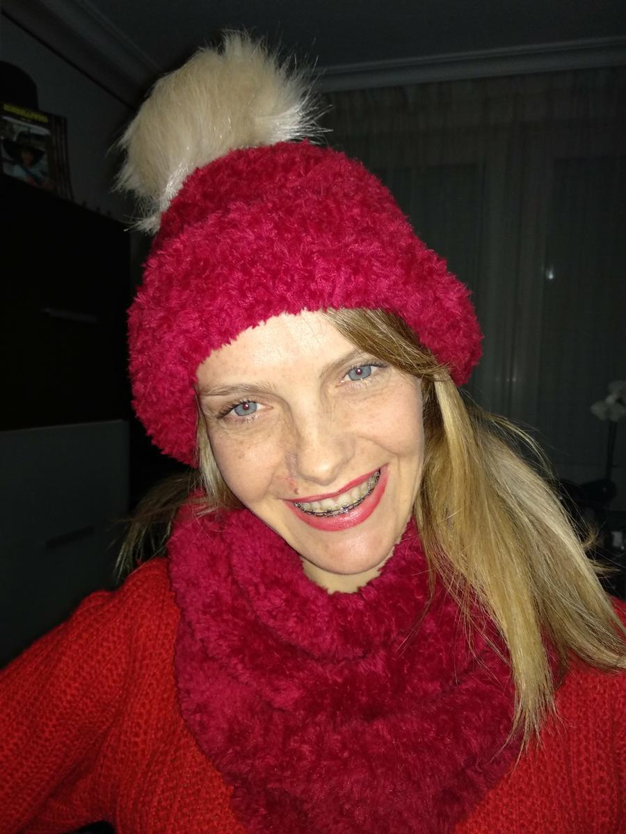Hola a todas. Me encanta hacer conjuntos en invierno de gorro y cuello en tonos rojos sangre como éste que le hice a mi hermana.