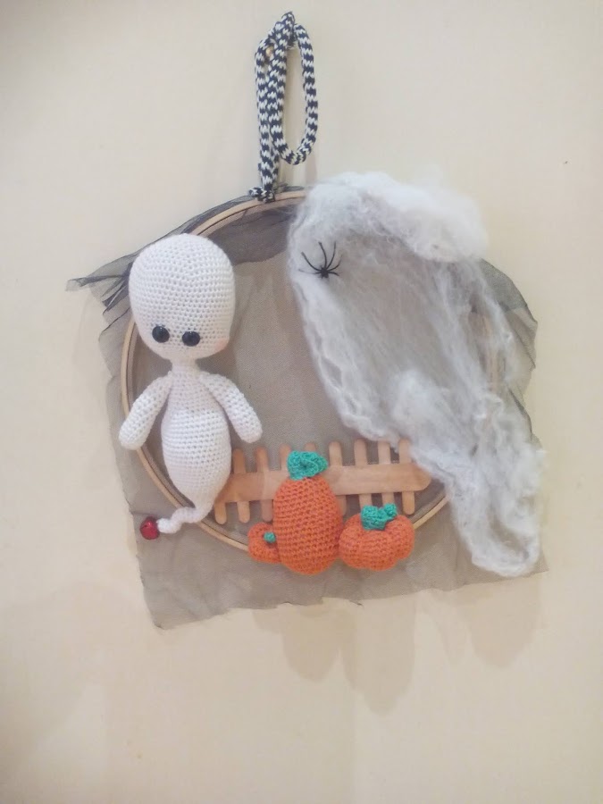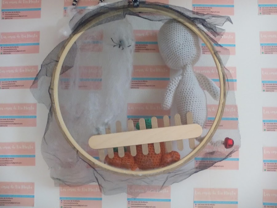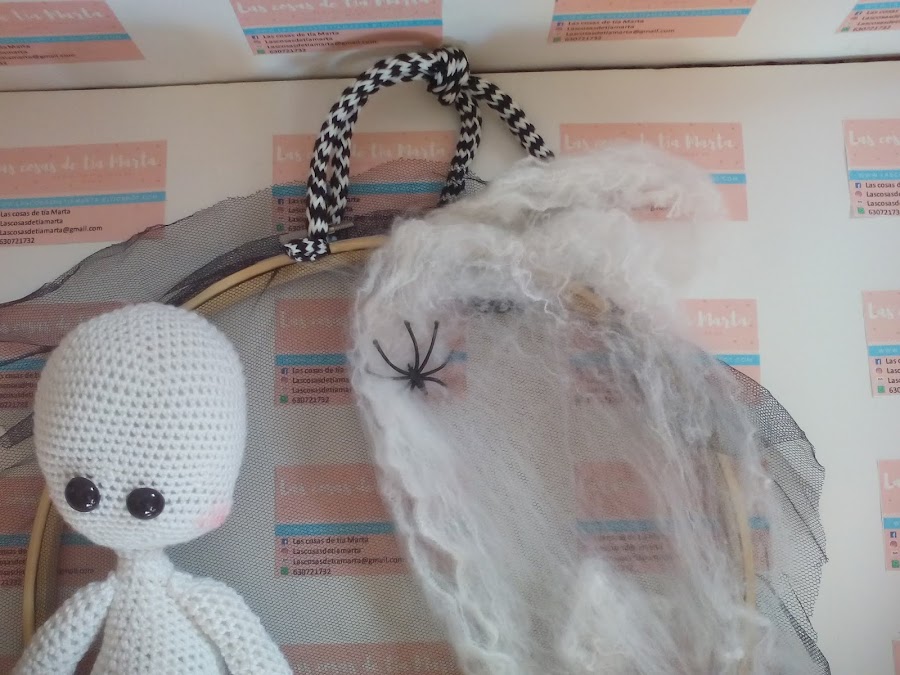 Yo lo he colocado sobre un bastidor de costura, también he utilizado tull negro, palos de helados envejecidos con tinta distress marrón chocolate. Y una gran tela de araña con una araña de plástico. Sin olvidarnos del detalle del cascabel de rojo para oír a Boo cuando se acerque para asustarnos.