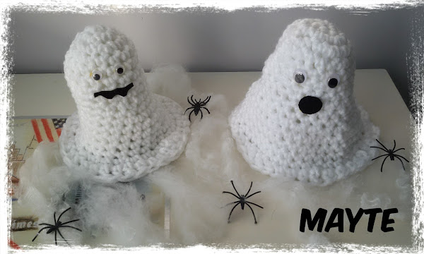 Gracias al Blog de Raquel que explica muy bien y es generosa con sus patrones he crocheado estos simpaticos fantasmas, uno es con hilo para lana del 9 de aguja y otro para lana del 6, así que siguiendo el patron y añadiendo alguna vuelta mas en las simples pues me han salido grandecitos......