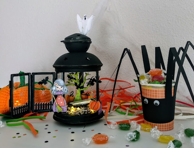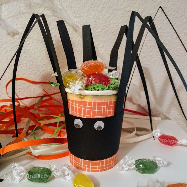 Para completar la decoración, también hice un vaso araña que va genial para guardar los carmelos.