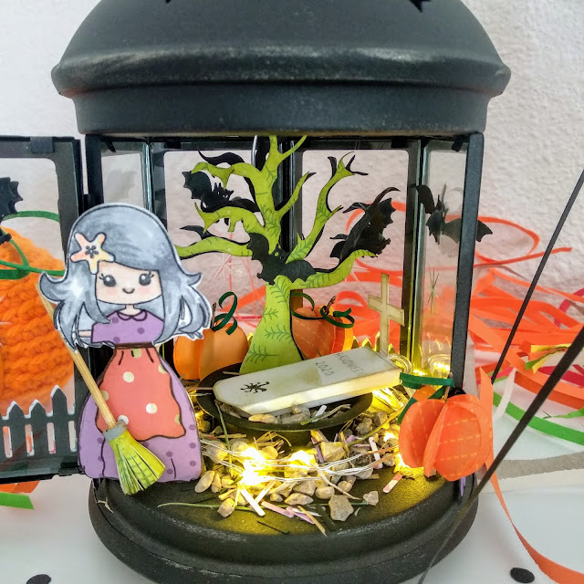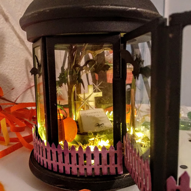 En mi caso, he customizado un farol porta velas y lo he convertido en un cementerio con luz incorporada.