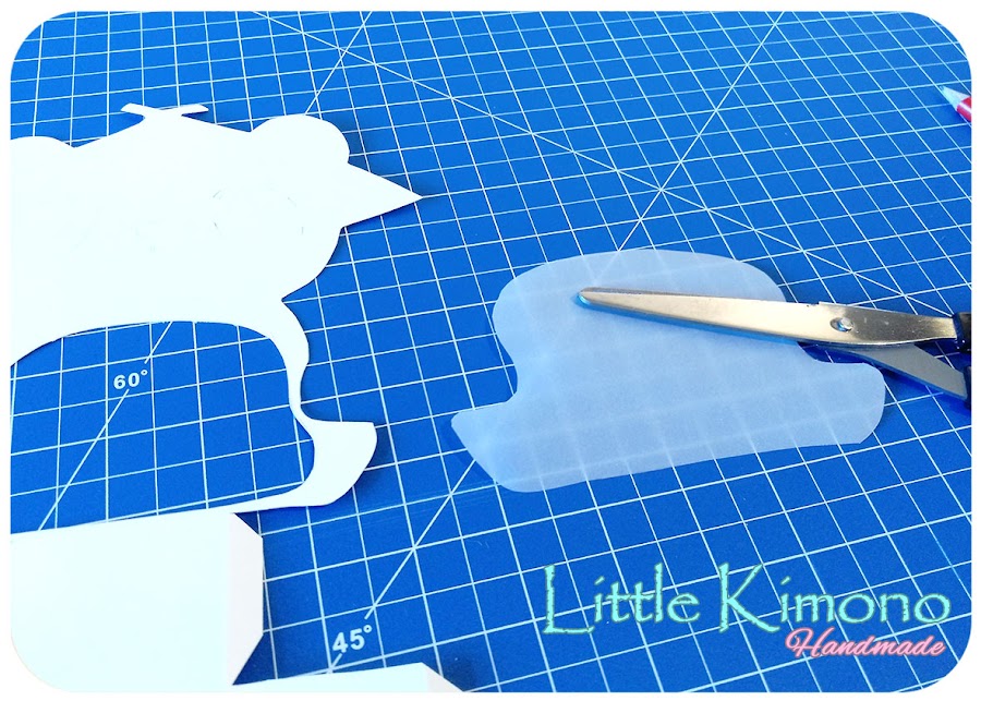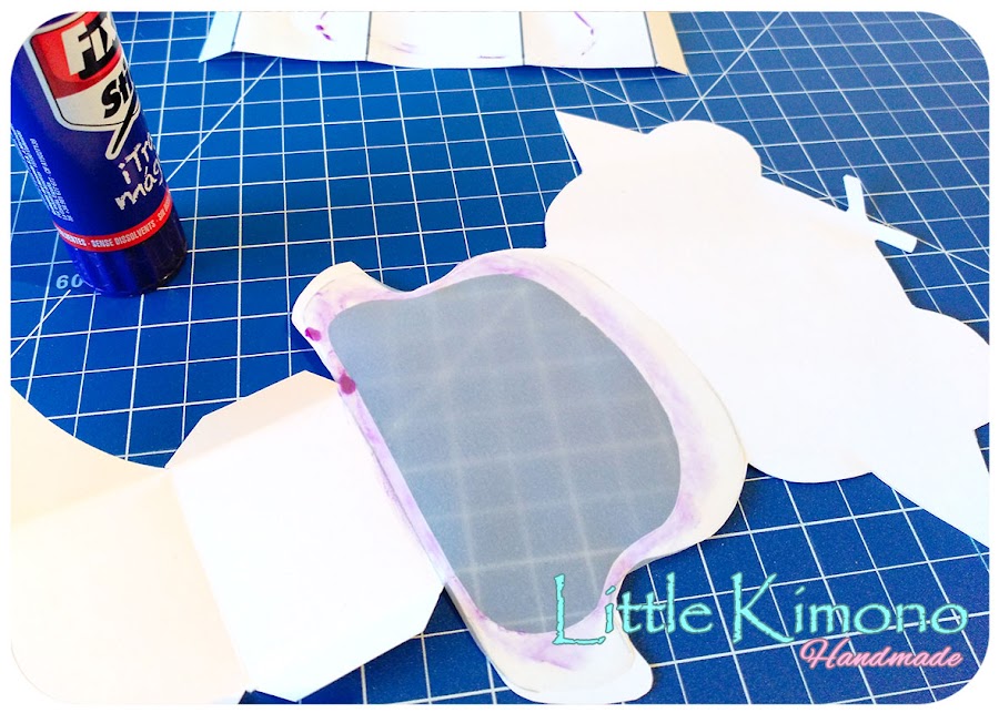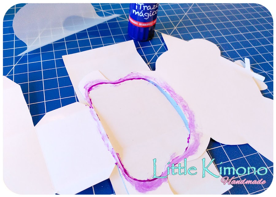 3. Cortamos la forma de la barriguita en el papel vegetal (dejando un pequeño margen para pegarlo) y pegamos por la parte de atrás con el pegamento de trazo mágico, como veis al aplicarlo es color morado pero a medida que va secando se vuelve transparente, esto nos permite ver dónde hemos aplicado el pegamento sin dejarnos ni un cachito ;) .