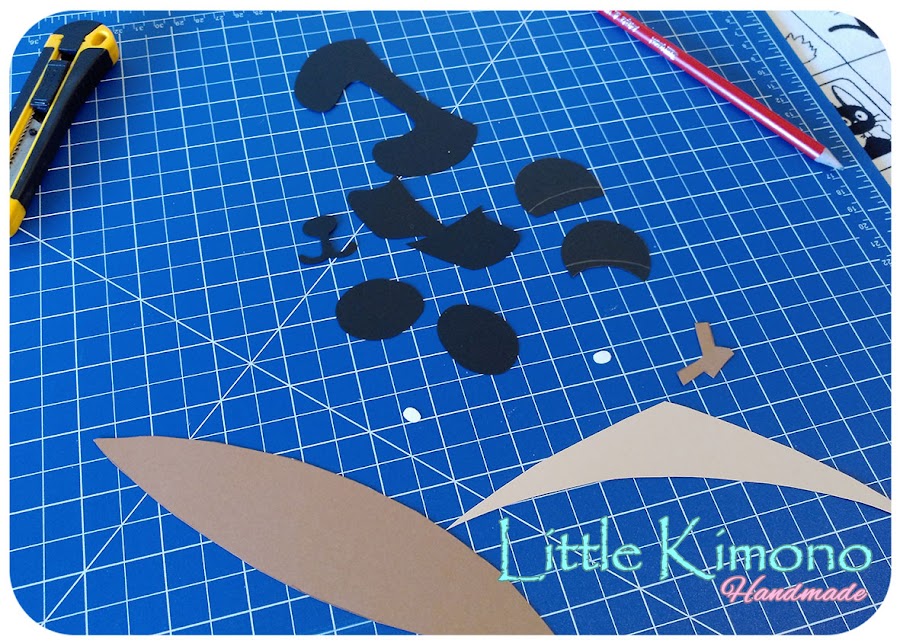 4. Cortamos las piezas, las manchas en la cartulina negra y las del sombrero en la marrón y beige.
