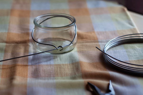Para hacer el asa, primero rodead con el alambre el cuello del bote. Enrollad la punta sobre el propio alambre, dejando medio dedo o un dedo de distancia con el bote. Luego estirad bien para apretarlo un poco y cread el asa.
