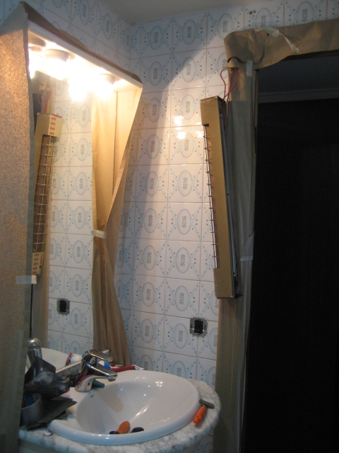 Todo tapadito, techo pintado y a por la primera mano de pintura blanca.