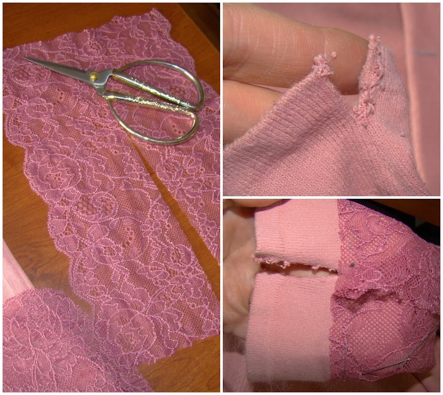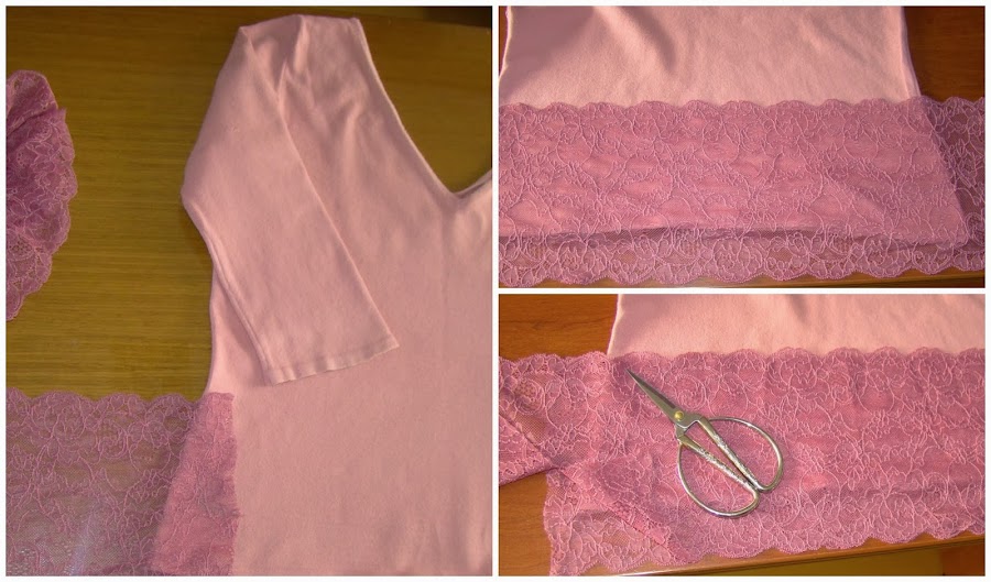 Intentando que la puntilla sobresalga el bajo original la misma distancia que hemos dejado en el puño, la vamos colocando, primero en los laterales para que el encaje, coincida sin problemas y después a lo largo de toda la parte baja del jersey.