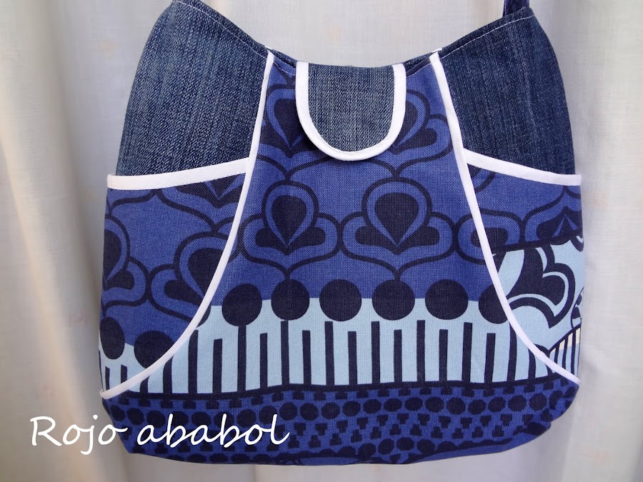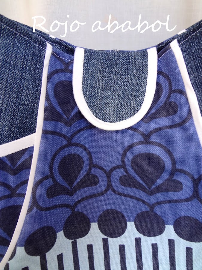 Los laterales con bolsillo en ambos lados, rematados con bies en blanco, igual que la unión con la parte central